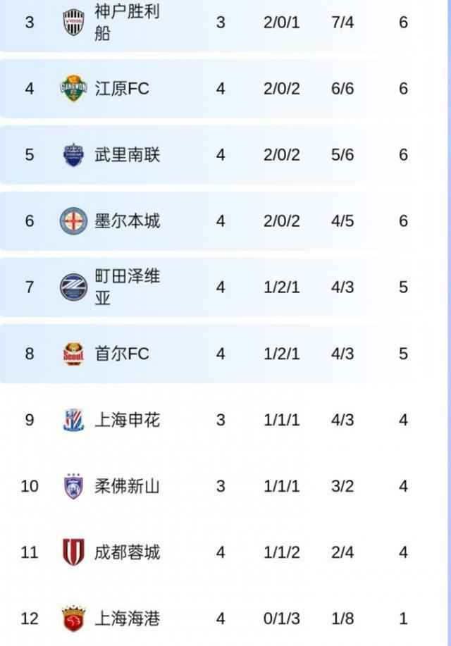 亚冠精英联赛东亚区积分榜,上海海港队4战后暂时垫底。